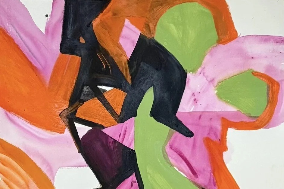 Drawing on personal history as well as daily life, Double Solitaire explores the paradox of oneness and towness, separatedness and connectedness. For me, each painting is it’s own kind of solitaire, full of play and experimentation, a series of wins and losses that eventually resolve into an image. Memories, artworks, people, and objects shuffle and reshuffle. Things are working well when each element plays multiple roles. A line divides and joins; a color harmonizes and clashes; the same form might evoke a building facade, a body part, and a dish of food. It can be all or none of these. Color, with its relational quality, is the consummate player.. Through its dynamic use, along with geometry, abstraction, and figuration, I strive to make work that is full of doubling, splitting, holding, and dividing like decks, like hands, like life.”