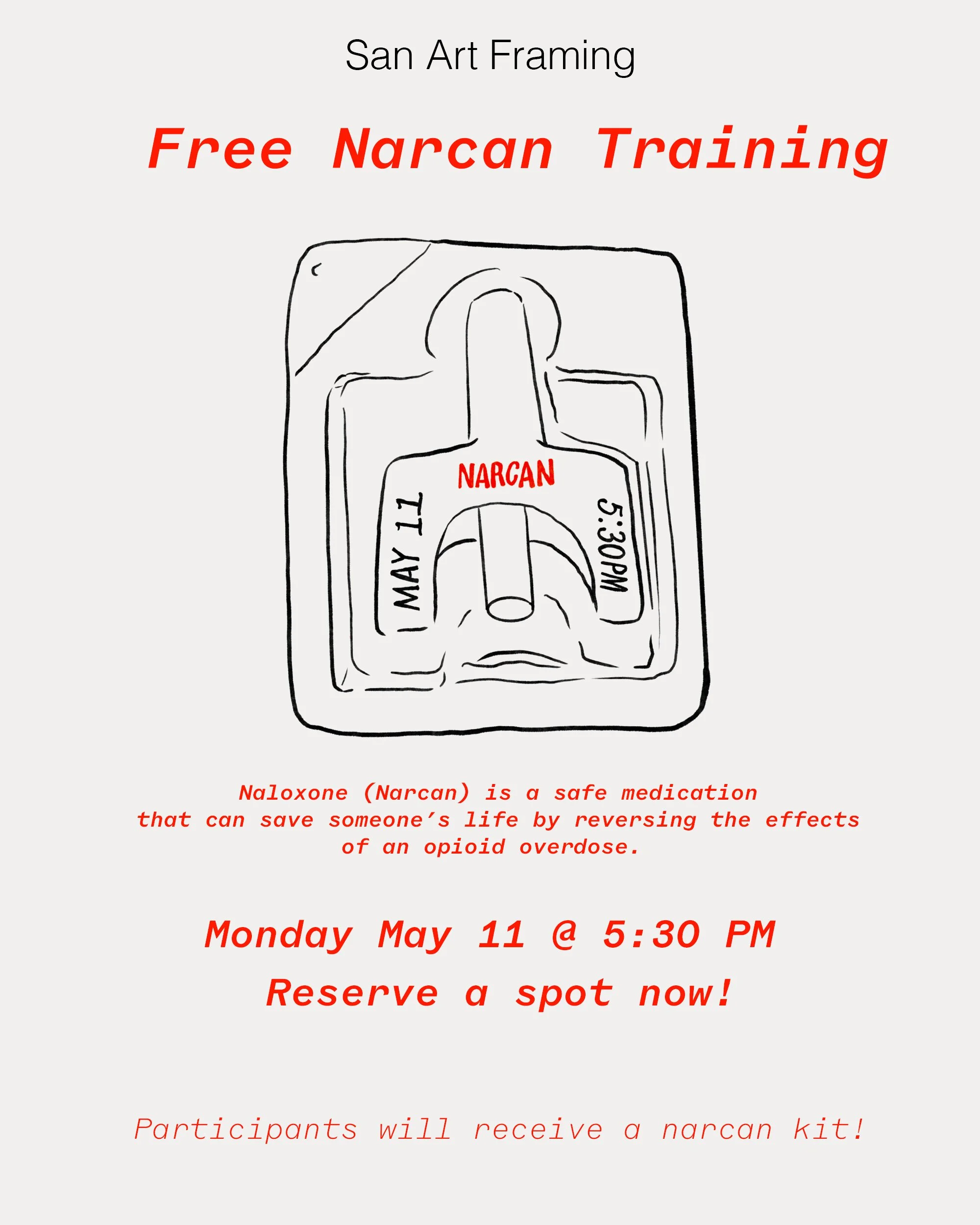 Join us at San Art Framing & Supply for a free Narcan training on May 11, 2026 at 5:30 PM (Eastern Time).