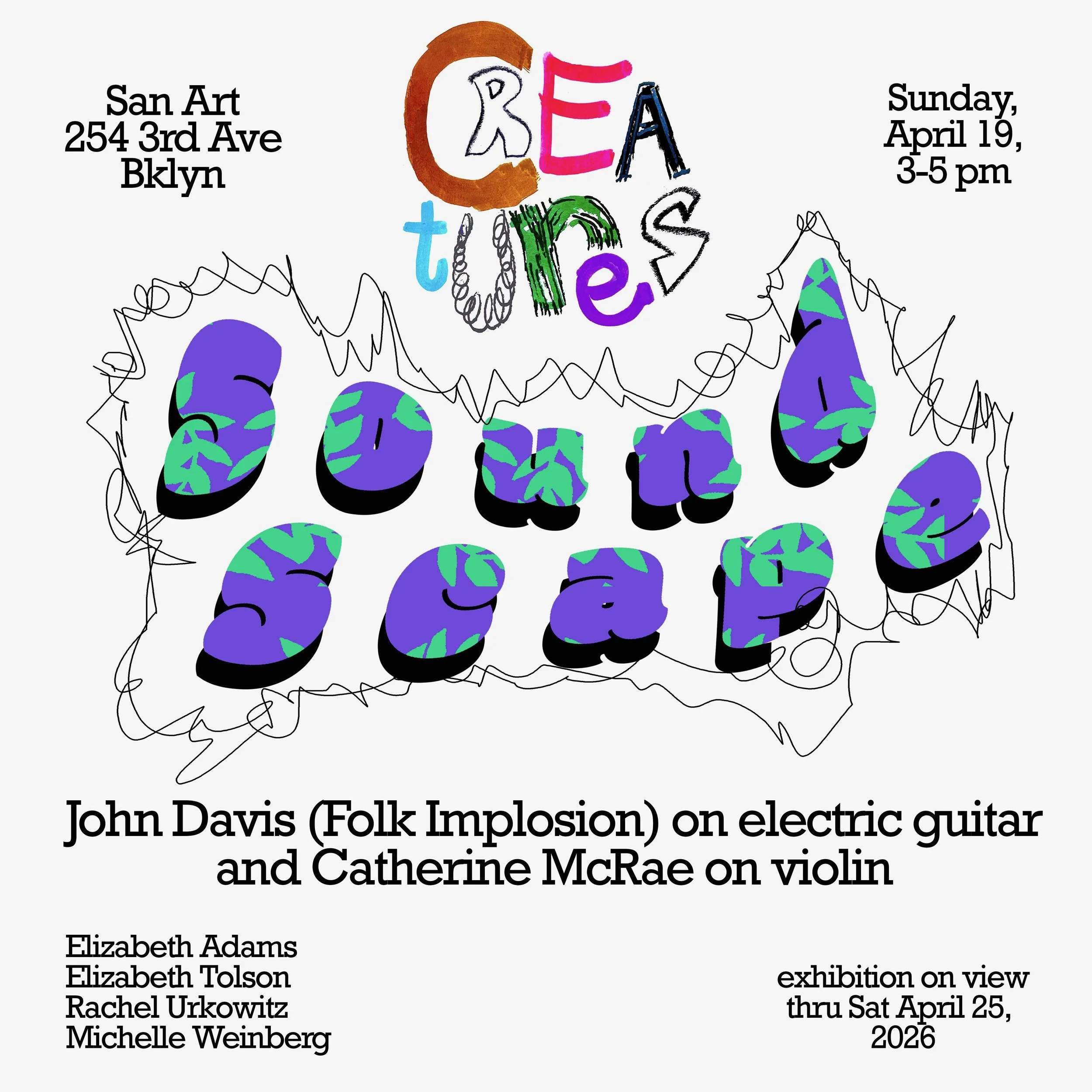 ‘CREATURES’ is on view at San Art through Saturday, April 25. This upcoming weekend, April 19, we are hosting ‘SOUND SCAPE,’ a celebration of the show featuring improved musical performances by John Davis of Folk Implosion and Catherine Mcrae on the violin.
